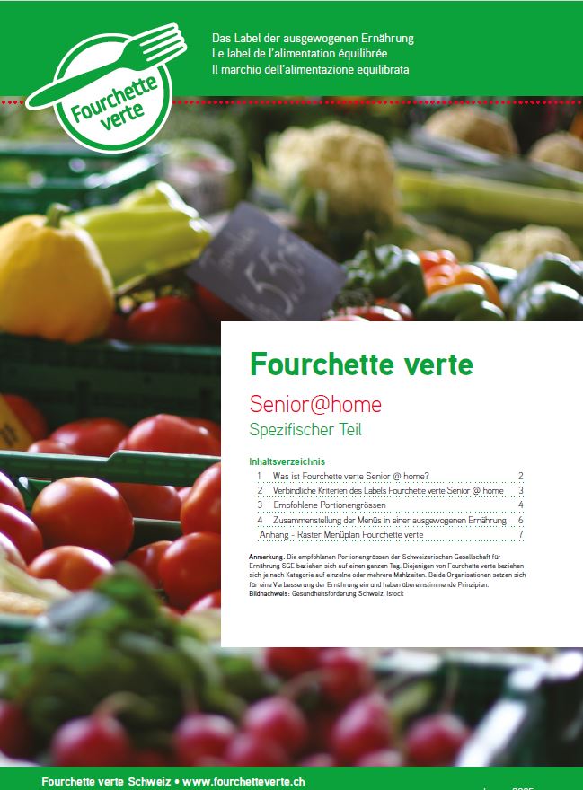 « Unser Mahlzeitendienst ist mit dem Label Fourchette verte Senior@home zertifiziert. Die Menüs sind ausgewogen, altersgerecht und entsprechen den aktuellen Ernährungsempfehlungen für Senior*innen. Sie fördern das Wohlbefinden, beugen Mangelernährung vor und unterstützen die Selbstständigkeit im Alltag. Die Zertifizierung durch das Fourchette verte-Team des Kantons Bern steht für geprüfte Qualität und schafft Vertrauen. Mit dem Label Fourchette verte Senior@home garantieren wir frische, nährstoffreiche Mahlzeiten – altersgerecht, geprüft und mit Herz zubereitet. »
